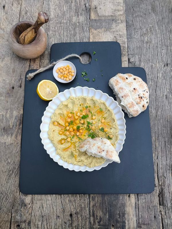Er sollte schön cremig und nicht krümelig sein, eventuell noch etwas mehr Wasser oder Griechisches Olivenöl dazugeben und nochmals pürieren.